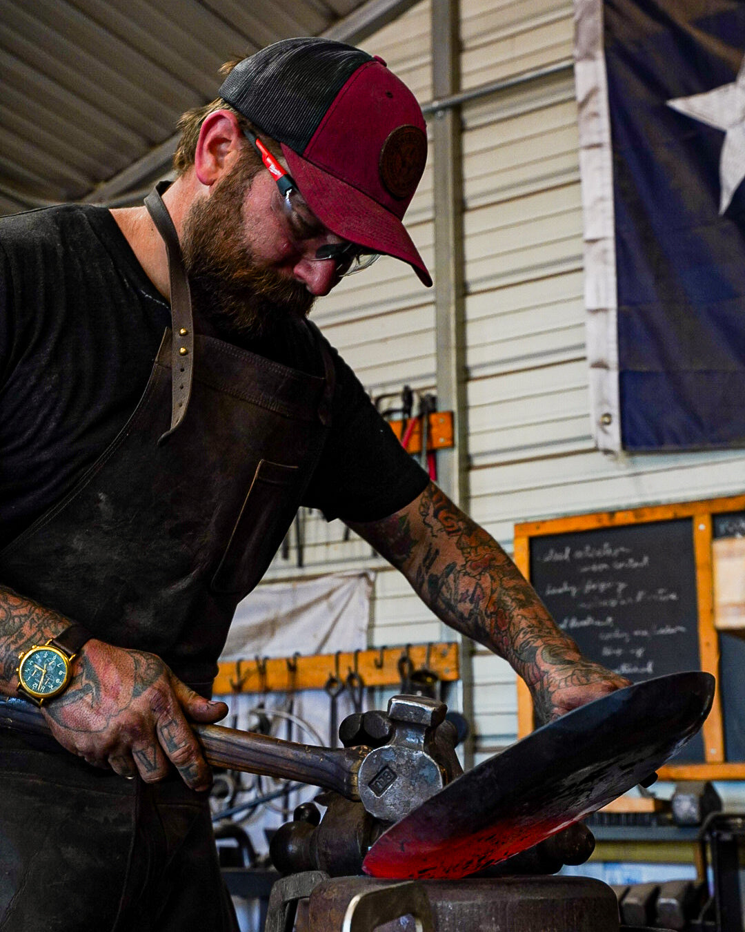 This skillet is hand-forged out of carbon steel with a brass riveted carbon steel handle.