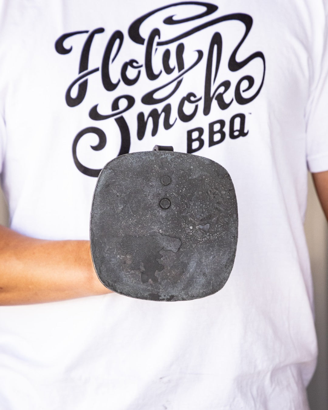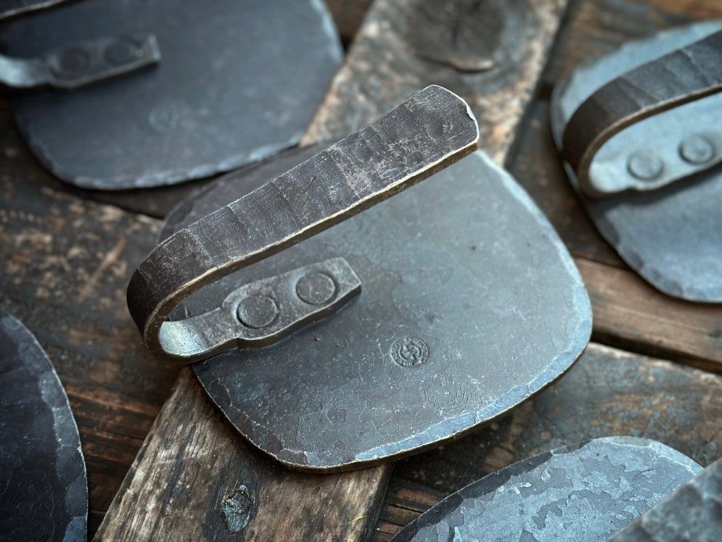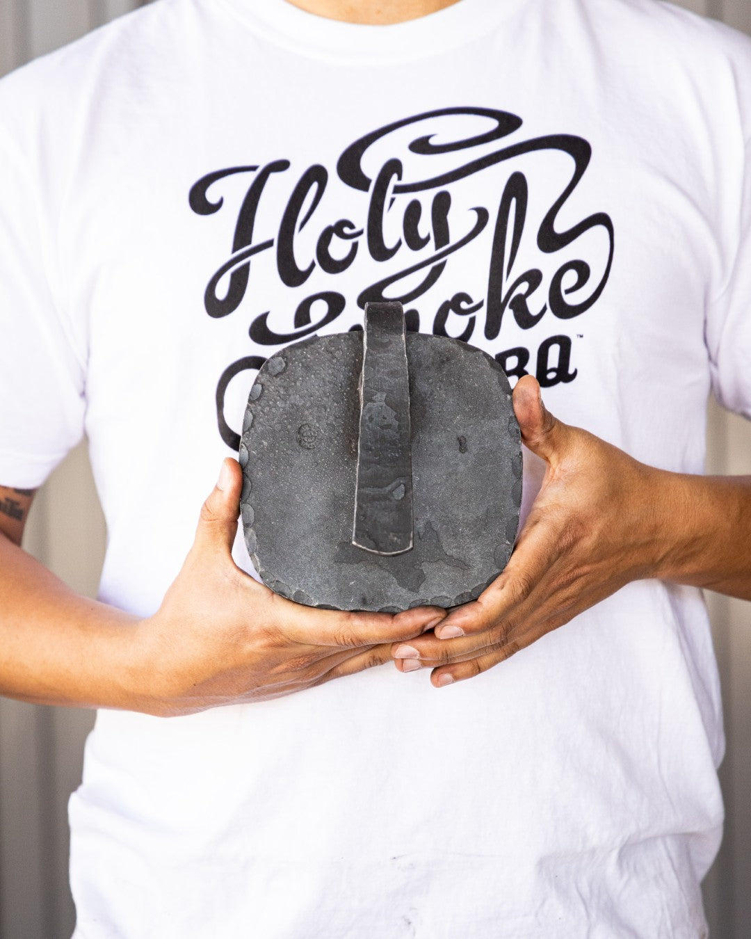 This burger press is hand-forged out of steel. Measures 6” in diameter, and weighs approximately 3 lbs.