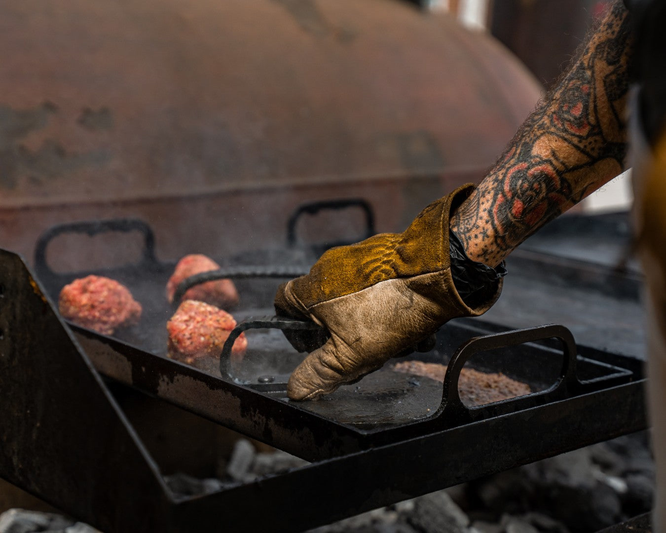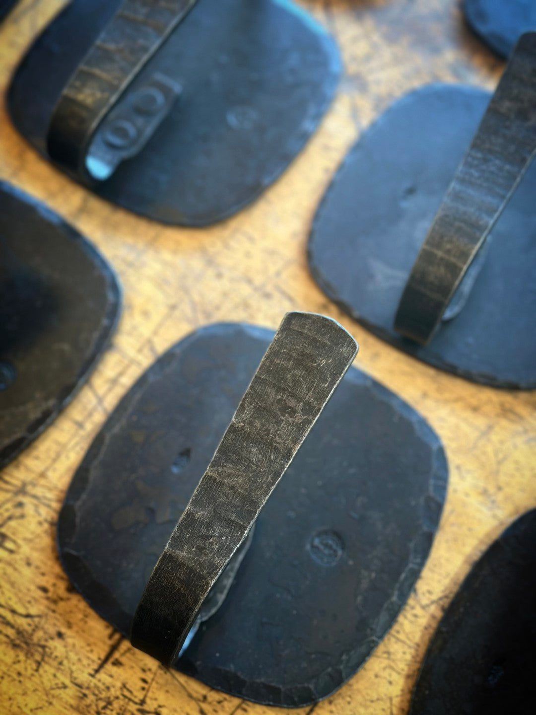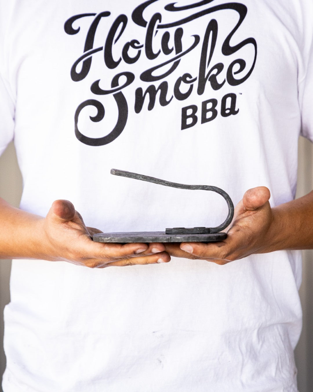 This burger press is hand-forged out of steel. Measures 6” in diameter, and weighs approximately 3 lbs.