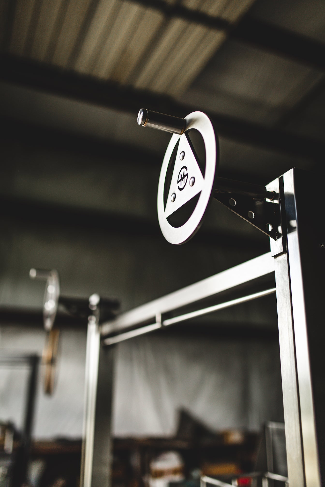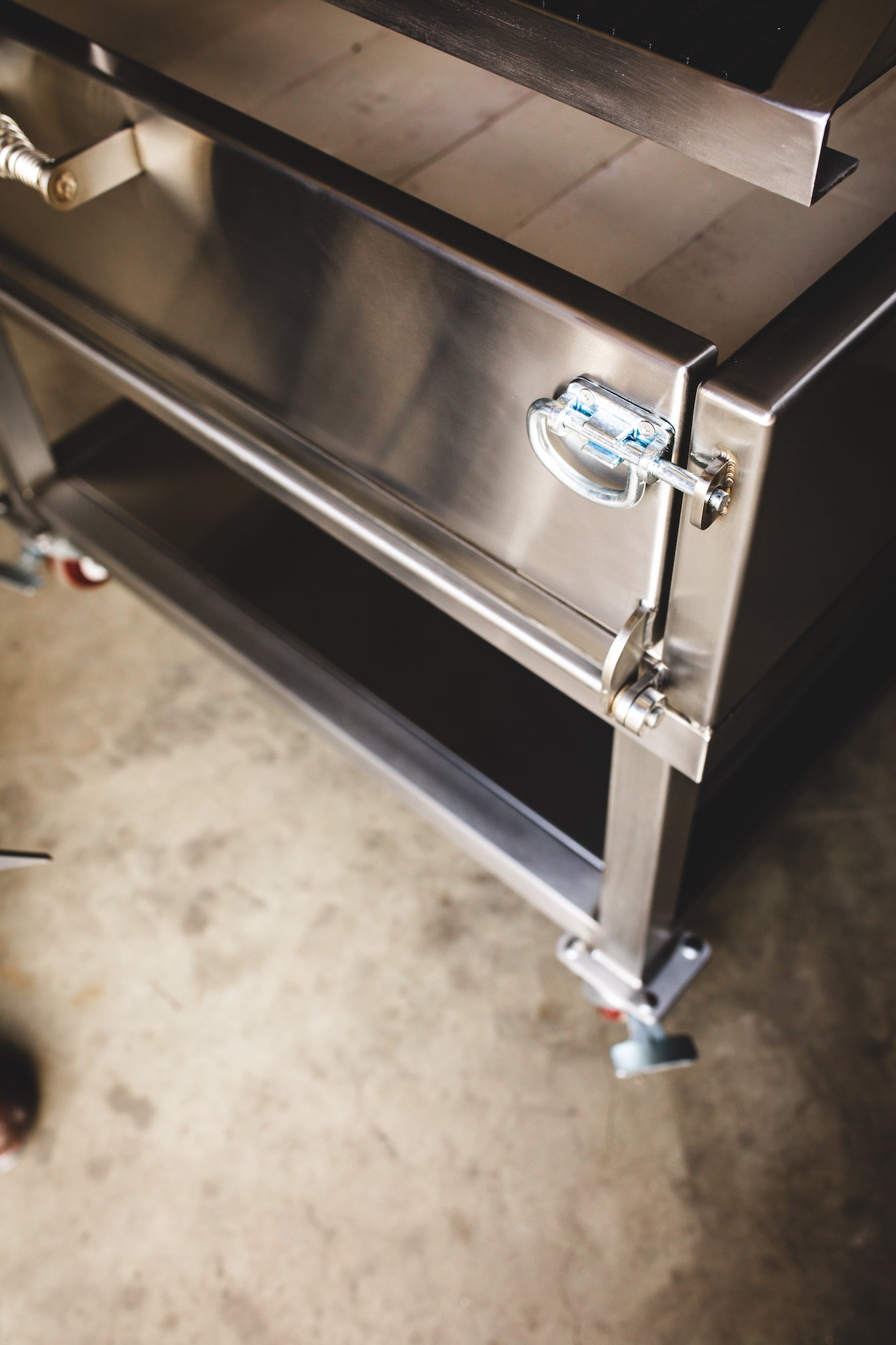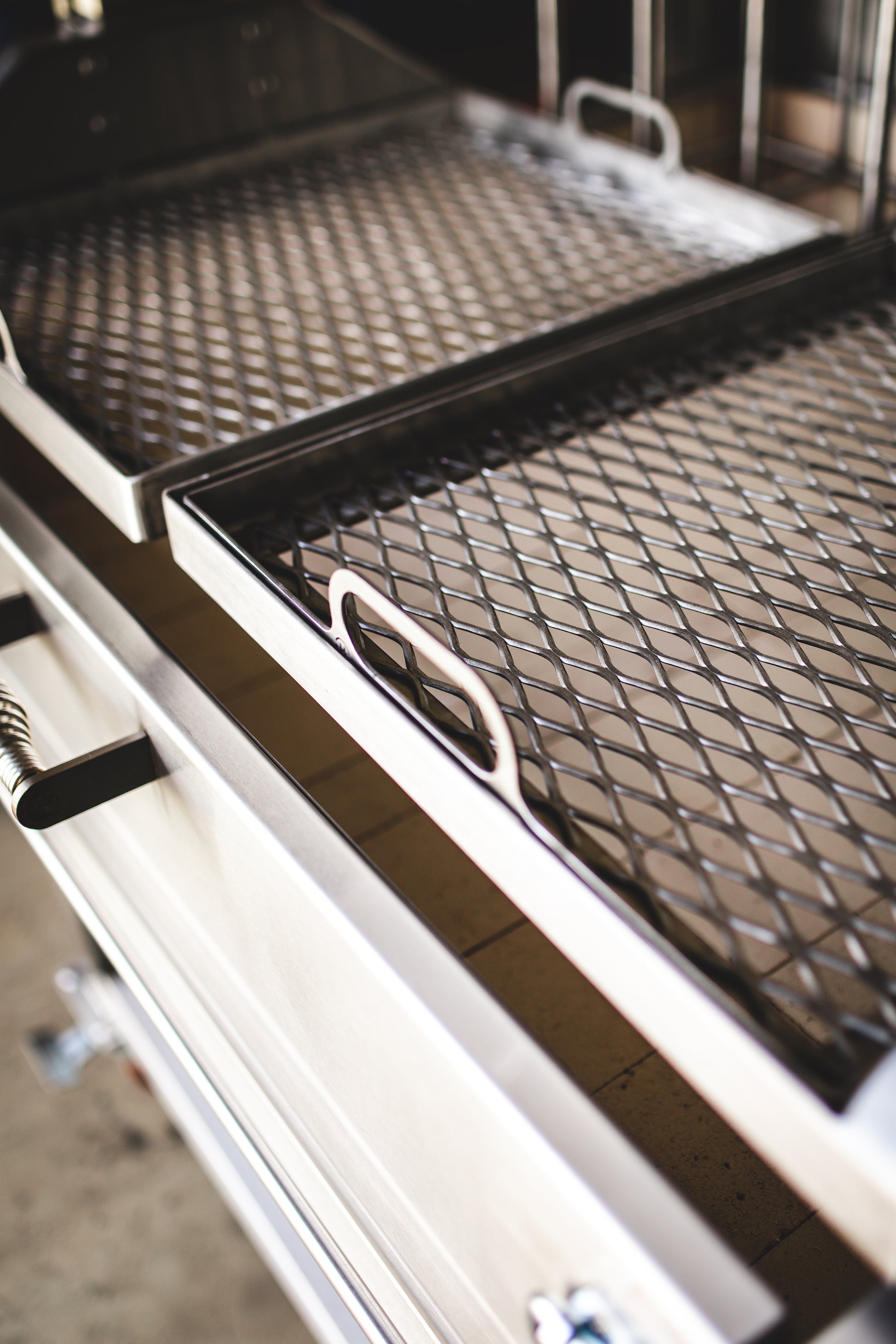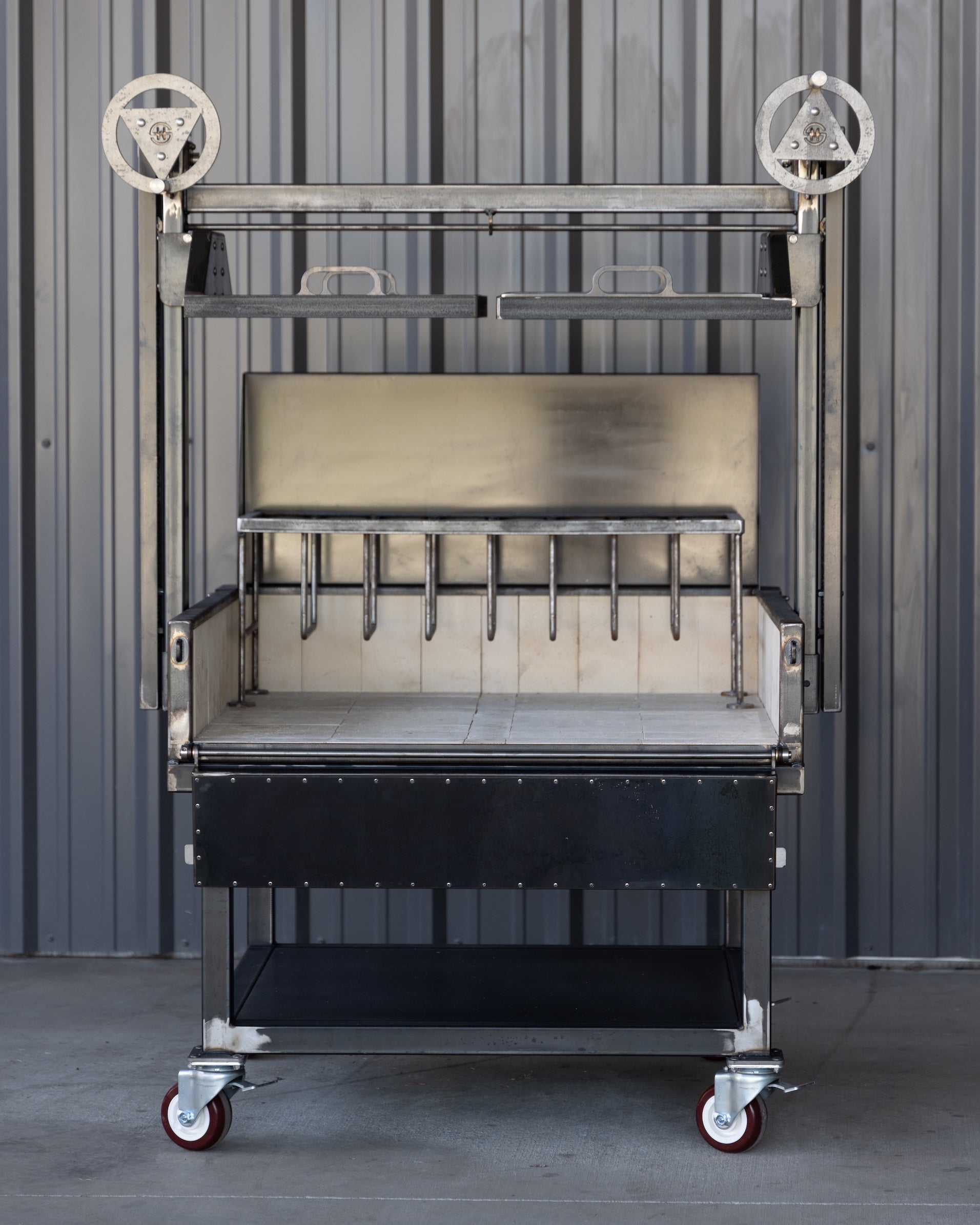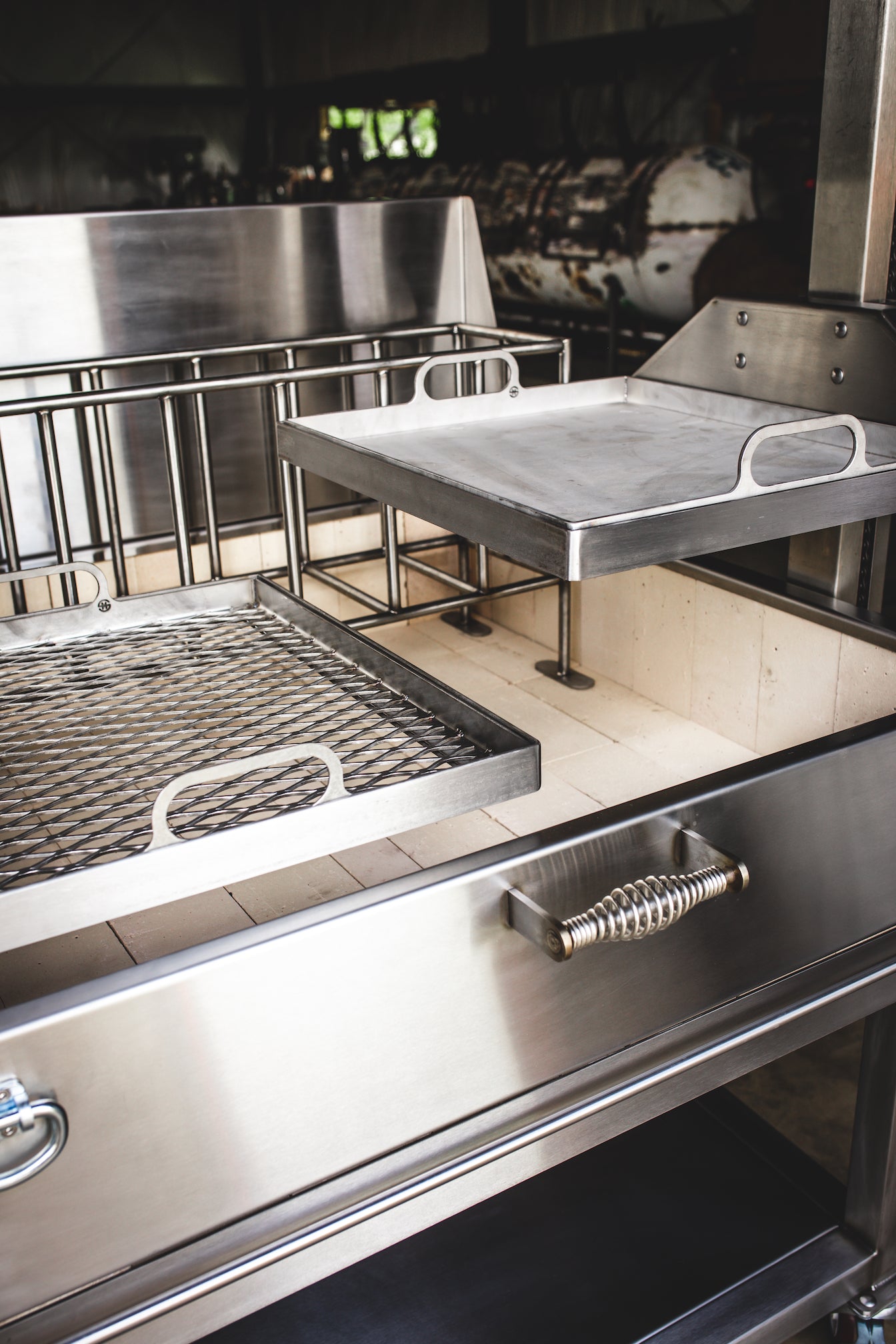 Two control wheels operate the independent lifting trays, making it easy to adjust the heat for different cooking techniques. The trays accommodate the following options for cooking surface inserts: cast iron grates, expanded metal grates, v-grates, and planchas. The basin is lined with firebrick to retain heat. A drop-down door at the front of the basin allows access to manage the fire and clean out the basin. The log burner is used to burn down whole logs into coals. Meats and vegetables can be hung from the top bar for slower roasting. The unit also has a lower storage shelf, heat shield, and is built on casters for easier maneuverability.