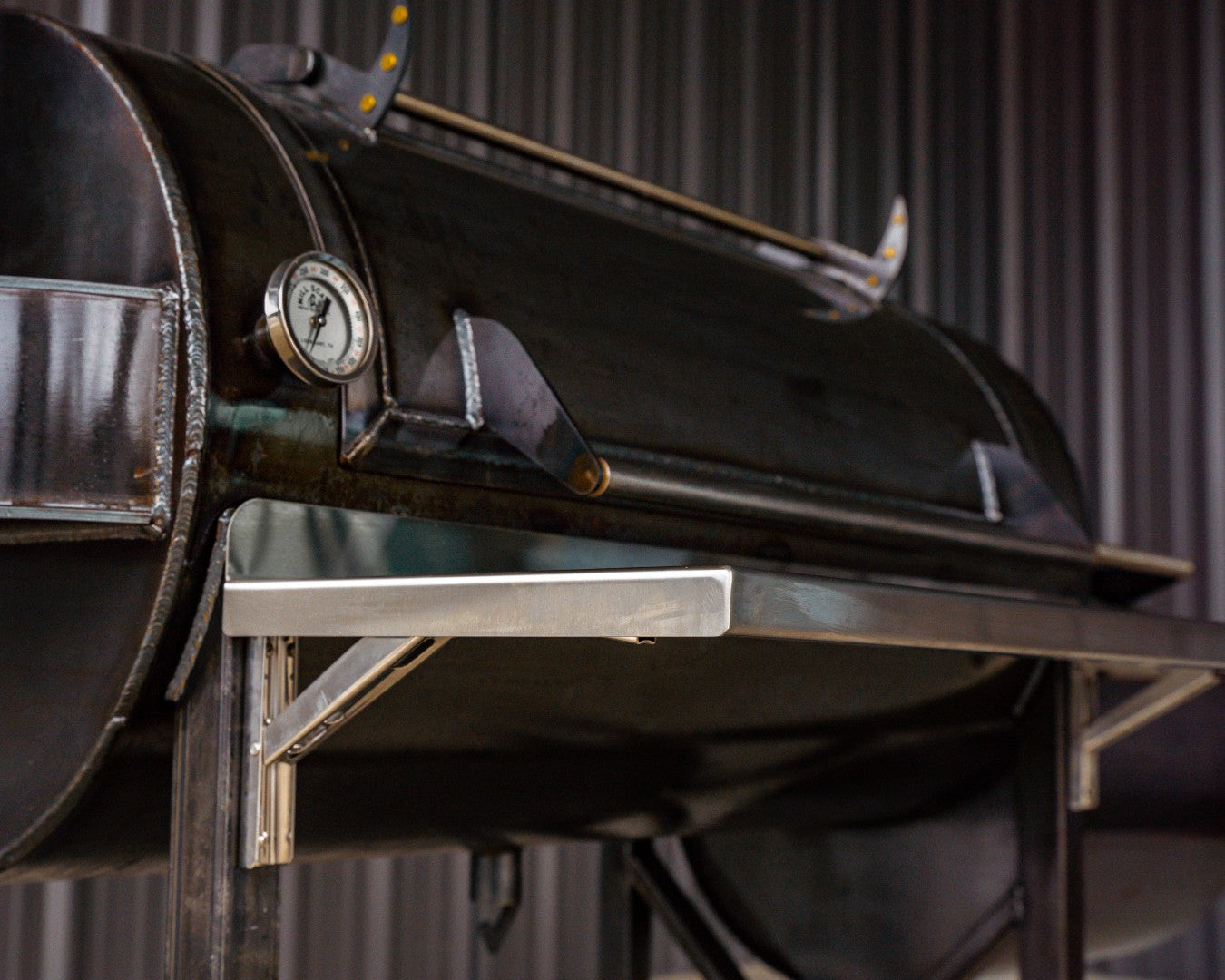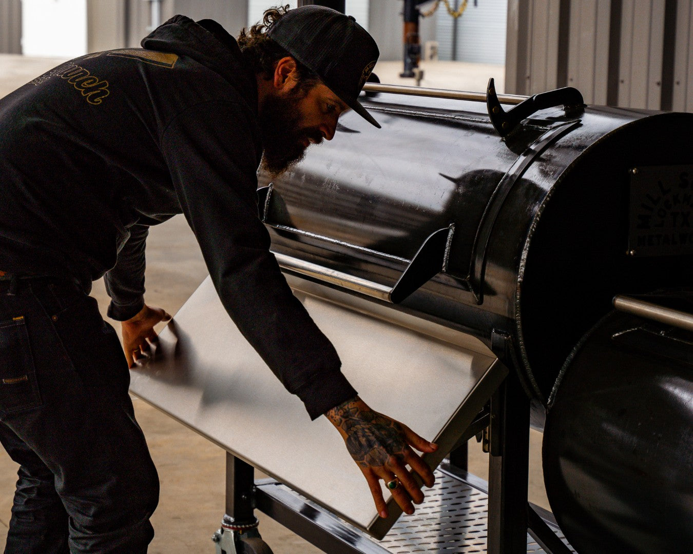 *Any 94 Gallon Smokers built before June 2024 will require you to drill and tap the mounting holes using an additional provided template. Please email us at info@millscale.co for further details before ordering, so we can add the template to your order. The total price for the Stainless Steel Fold-Down Prep Table and Template will be $840.