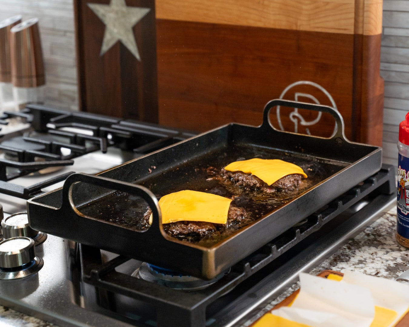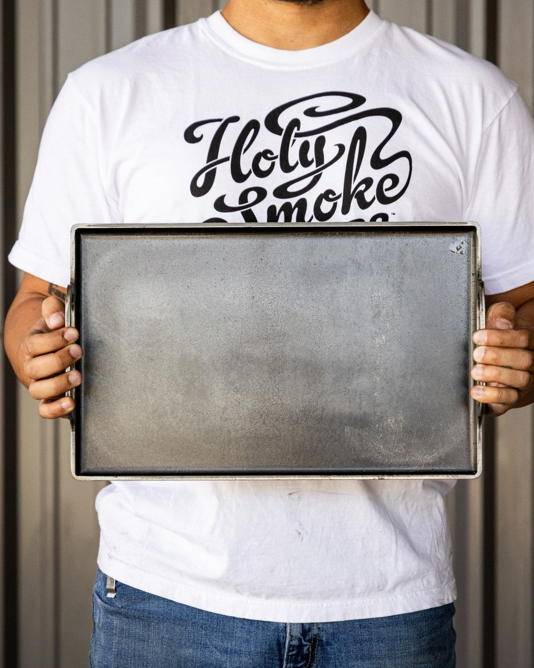 This steel Stovetop Plancha is a portable surface for open-fire cooking, and is perfect for cooking meat, fish, and vegetables. The integrated handles make it easy to transfer from the stovetop to the oven.