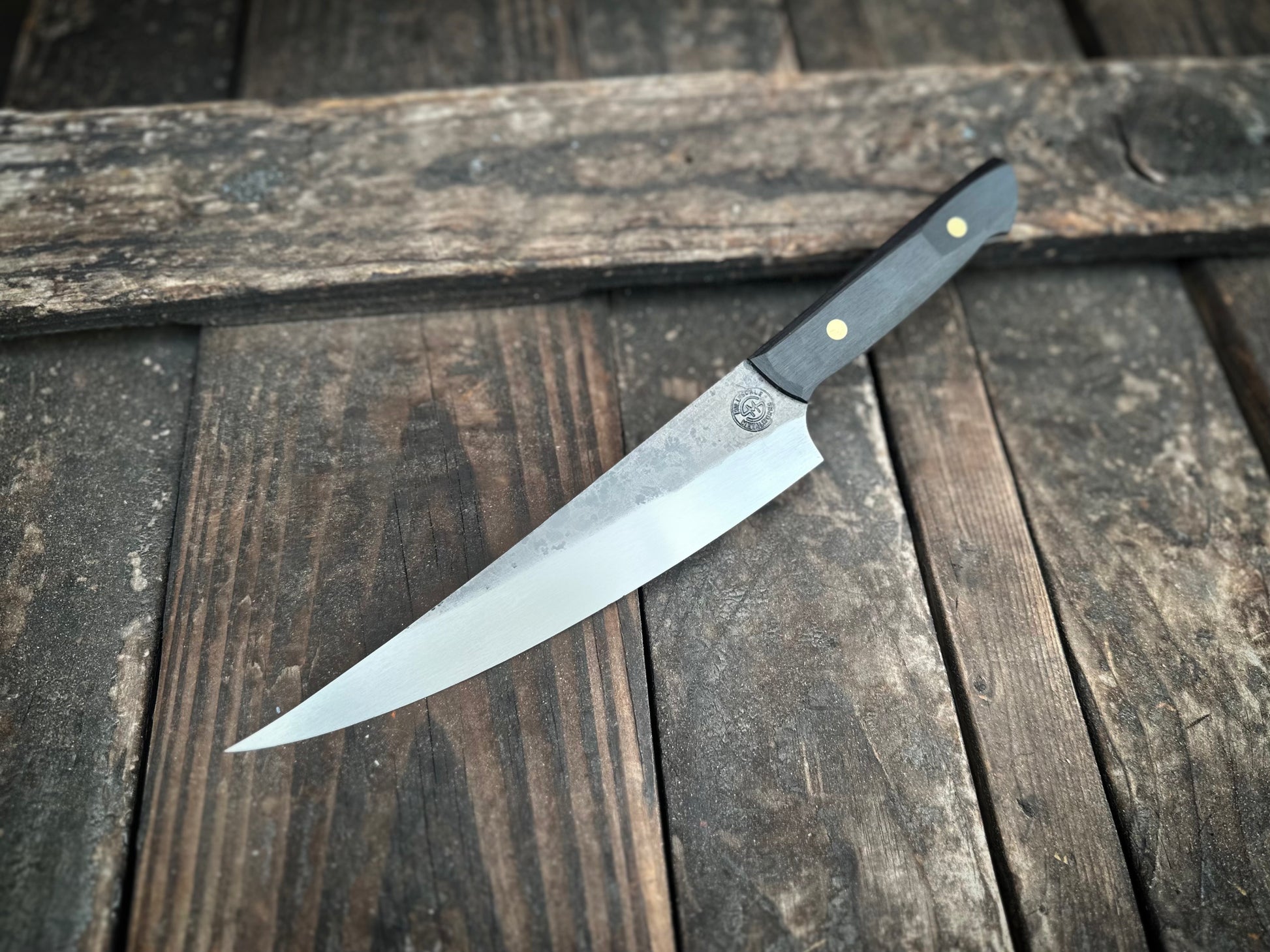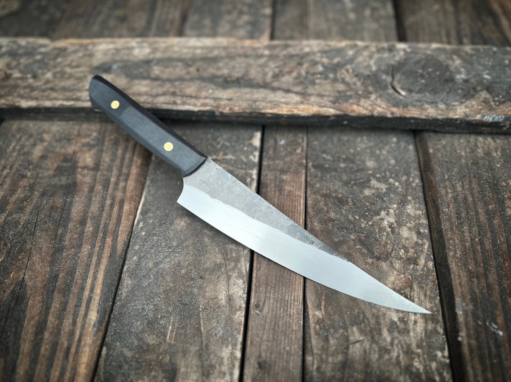 - Full tang in black birch wood with 1/4" brass pins