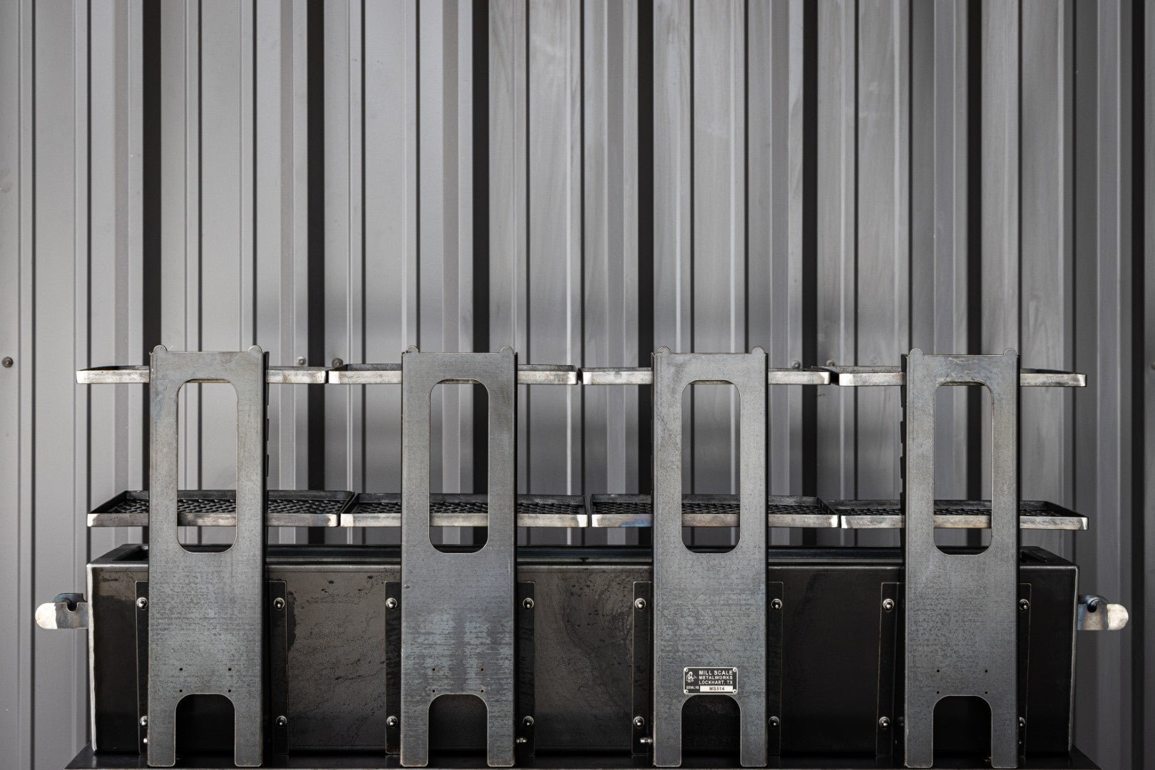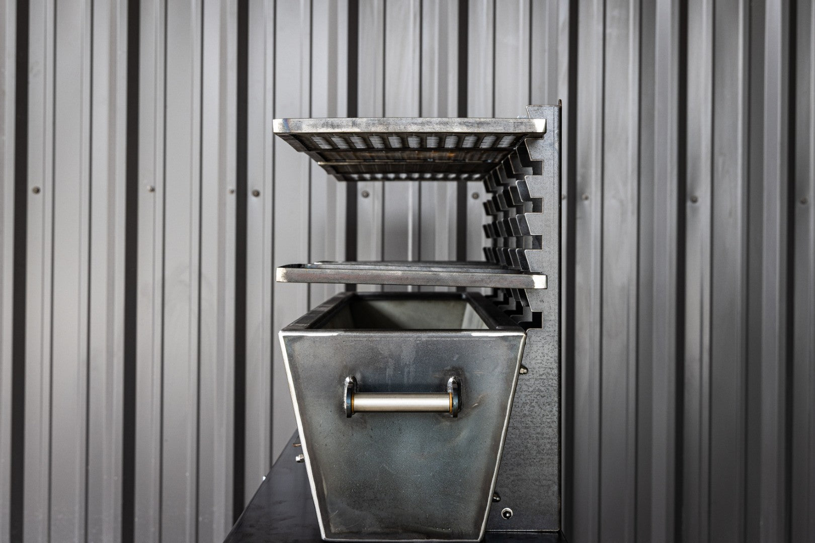 Our yakitori grill is a central-Texas take on a traditional Japanese grilling style. This multi-level grill allows for a versatile and adaptable cooking experience. Each rack can be moved to a higher position for resting or slow-cooking, or keep them in the lower positions for searing.