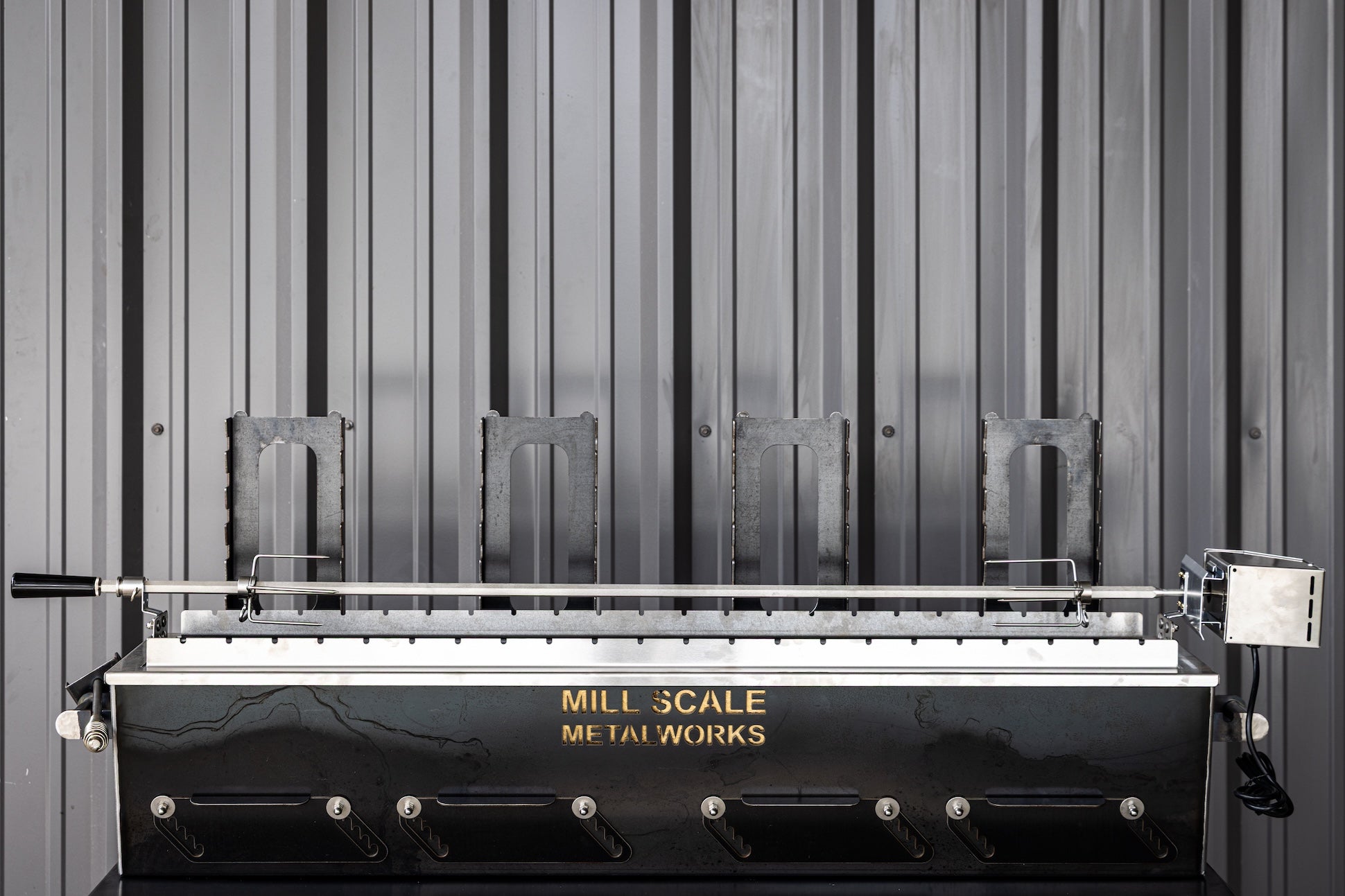Yakitori IV Rail can accommodate motorized rotisserie kit (sold separately here) or twenty-two skewers: 14"-16"